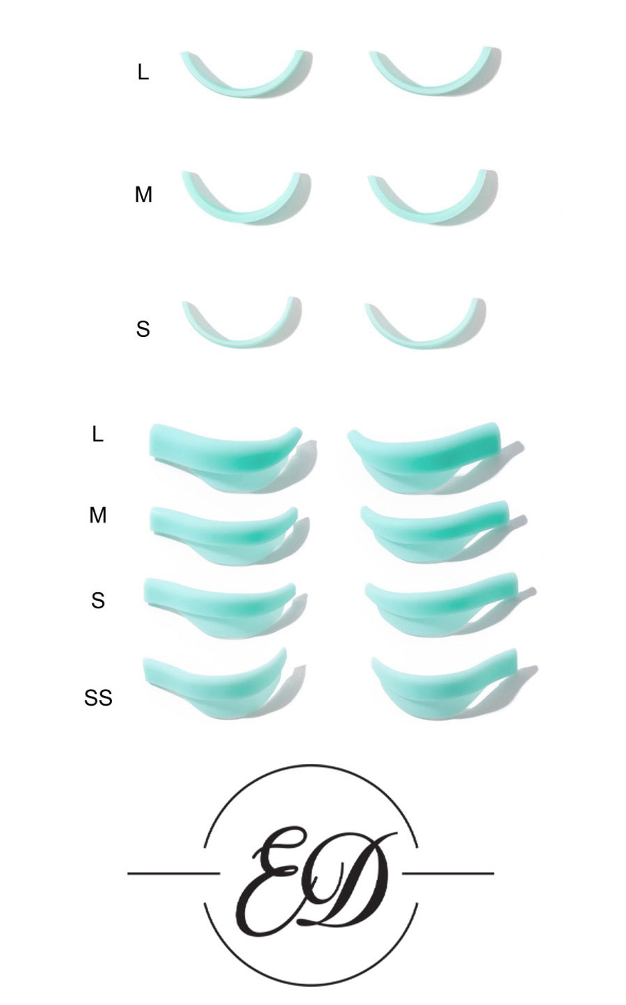 Chaque boîte contient 7 paires de pads en silicone disponibles dans les tailles SS, S, M et L. Le choix de la taille dépend de la longueur naturelle des cils et de la courbure souhaitée : des tailles plus petites donnent une courbure plus prononcée, tandis que des tailles plus grandes offrent un lift plus naturel.